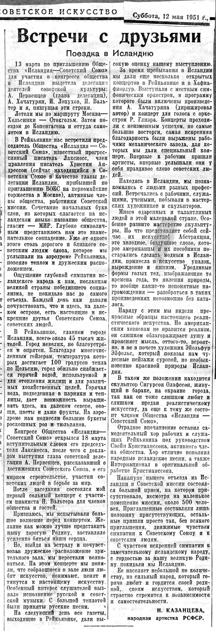 Газетная вырезка: Статья Н.Казанцевой в Советском искусстве от 12 мая 1951 г.