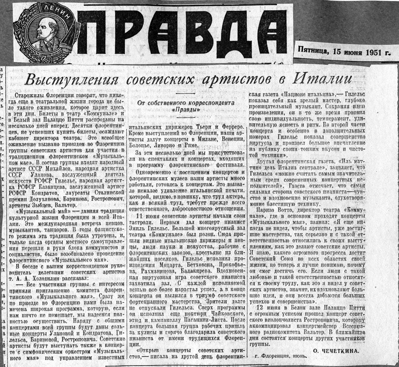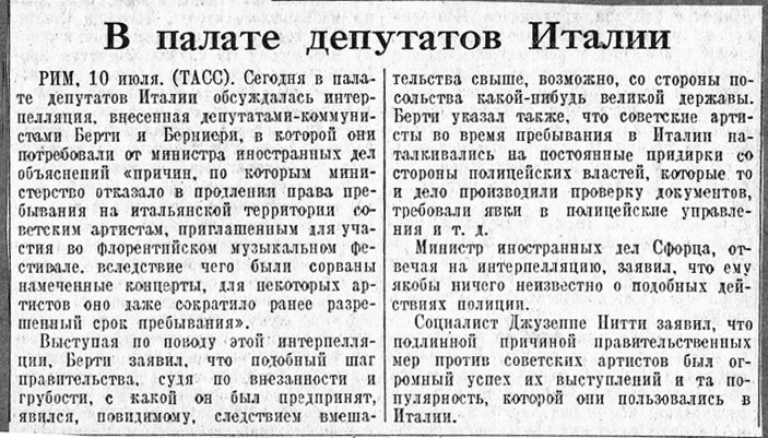 Газета "Правда" о выступлении советских артистов в Италии.