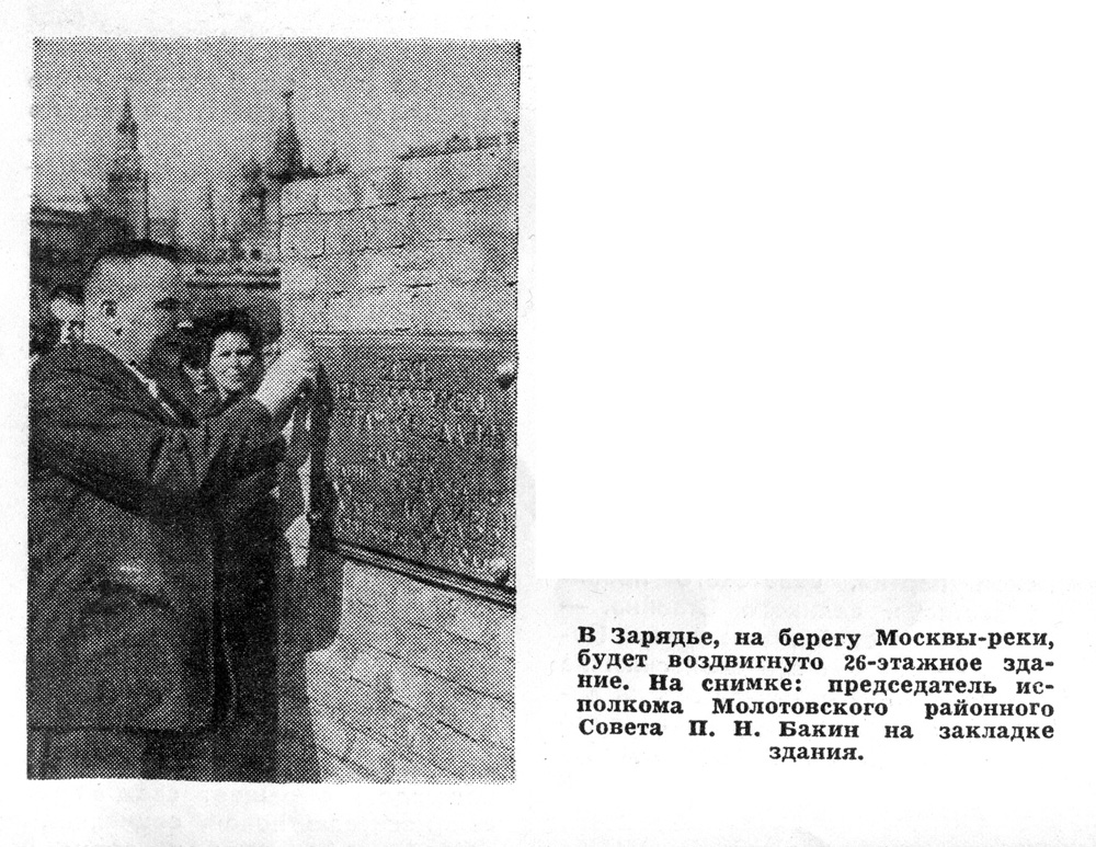 К началу тридцатых годов древнее Зарядье представляло собой неблагополучный, криминальный район с обветшавшими строениями. Само название отражало его суть — за торговыми рядами находились не только церкви и памятники старины. В дореволюционную пору это место славилось мастерскими, лабазами, ночлежками, публичными домами. Канализации не имелось, и нечистоты текли прямиком в реку. Такая картина была характерна и для многих других районов столицы. Планомерный снос района приурочили к реконструкции Москворецкого моста и территорий, прилежащих к Красной площади. Проектом А.В. Щусева в 1937 году предусматривалось значительное расширение проезжей части моста, вместе с этим расширять его можно было только в сторону, противоположную Красной площади. Возникали и проблемы, связанные с подъемом уровня грунтовых вод в результате обводнения Москвы-реки волжской водой. Одним словом, по объективным причинам участь района была предопределена, и к началу 1939 года основной объем работ по его сносу уже выполнили. Вплоть до конца сороковых годов на месте Зарядья просуществовал пустырь, а с начала пятидесятых начались разработка котлована и бетонирование фундамента высотного здания.
