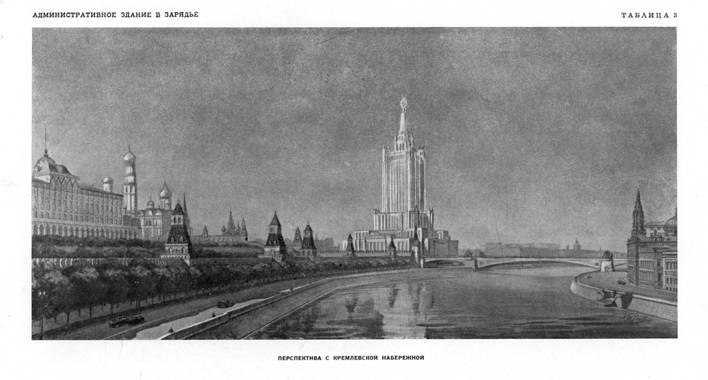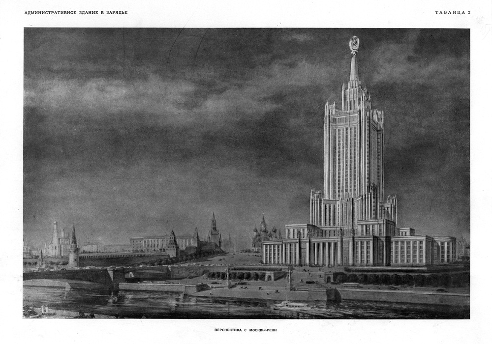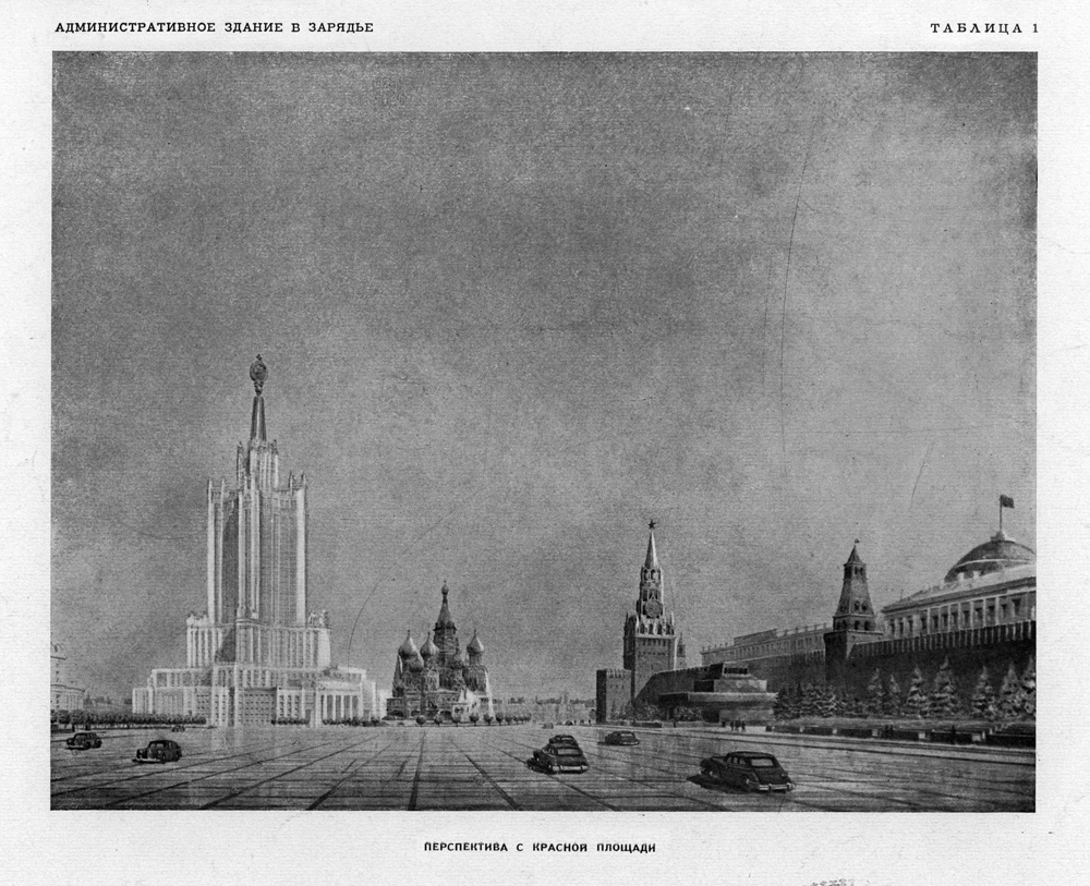 Историки порой вменяют в вину Сталину то, что он якобы варварски уничтожил Зарядье для постройки 36-этажного монстра в непосредственной близости от Кремля. Однако в действительности снос Зарядья не был напрямую связан с планами строительства на этом месте какого-либо конкретного сооружения. До войны вносилось большое количество проектных предложений от многих архитекторов, некоторые из них в соответствии с условиями конкурсов предполагали и снос здания ГУМа. От тех лет идет целая череда конкурсов, в которых принимали участие А.Щусев, А. и В. Веснины, И.Жолтовский, Г.Гольц, Н.Колли, Б.Иофан, В.Щуко, В.Гельфрейх, А.Мордвинов, П.Абросимов, А.Власов, и многие другие. В проектах мавзолей В.И. Ленина, Красная площадь, ансамбль Московского Кремля и то, что предполагалось построить рядом, должны были создавать грандиозную по своим масштабам единую декорацию для оформления всенародных торжеств и празднеств. В конце концов, как известно, к строительству был принят проект Весниных, но осуществлению замысла помешала война. Это при том, что значительные силы оттягивало и строительство Дворца Советов.