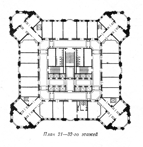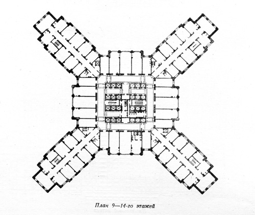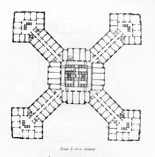 Начиная со второго этажа все здание, за небольшим исключением, предоставлялось под рабочие помещения. Хорошо освещенные комнаты располагались по периметру здания, с обеих сторон диагональных коридоров. Диагональные коридоры заканчиваются треугольными тупиками, по периметру которых находились рабочие комнаты. Каждая из них имела свою маленькую вестибюльную площадку. Начиная с 8-го по 13-й этаж диагональные коридоры укорачивались, треугольные тупики уничтожались. С 14-го этажа пропадали и диагональные отсеки. Оставались только лифтовые фойе с рабочими комнатами. И, наконец, в венчающей части здания располагался демонстрационный зал, перекрытый куполом и четырьмя павильонами по углам плоской кровли... В 5-этажных корпусах, которые окружали высотную часть, также планировались рабочие комнаты.