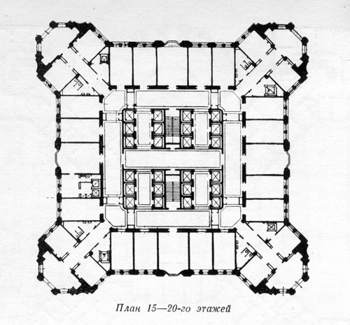 Центральный ствол здания должен был обслуживаться 24 лифтами. Исходя из условий планировки, наиболее эффективным оказался прием разделения работы лифтов на две зоны: первая зона обслуживала 1-18 этажи, вторая – 18 – 32. Таким образом, на 18-м этаже обеспечивалась бы возможность пересадки из подъемников первой зоны в подъемники второй и наоборот. Подъемники второй зоны должны были обслуживать и башню, венчающую здание. В дополнение к ним, проект предусматривал достаточное количество удобно расположенных аварийных лестниц, которые располагались равномерно, удаляясь от центра по мере расширения здания книзу. Лифтовые холлы и лестницы располагались в наиболее удобных для этого узлах плана и везде выходили непосредственно в коридоры. Количество лифтов возрастало от верхних этажей к нижним. Если в верхнем этаже два лифта, то в гардеробном вестибюле их было уже сорок. Для рассредоточения потоков больших масс людей в диагональных крыльях высотного корпуса также были запроектированы лифты. Всего в здании проектировалось 2000 комнат общей площадью 72000 кв.м.