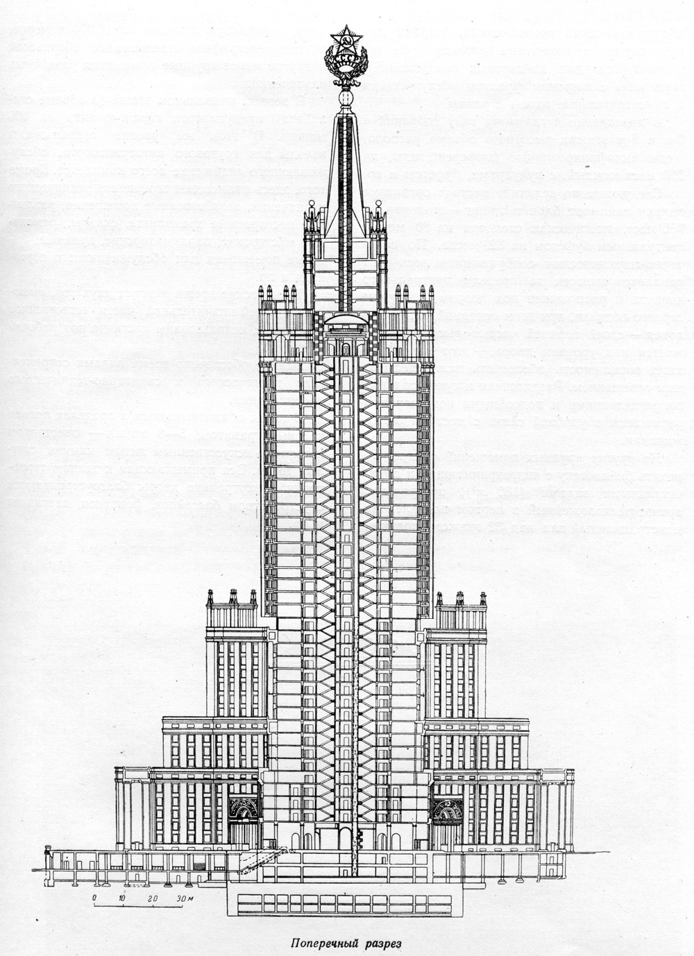 Без теснейшего синтеза архитектуры, науки и передовой советской техники осуществление высотных зданий было бы невыполнимо. Не говоря о необычных приемах конструирования, в структуру высотных зданий вошли разработки из самых разных областей техники. Переход от несущих кирпичных стен к стальному каркасу явился одним из крупнейших факторов в развитии советской строительной отрасли. Каркасная система позволила свести роль наружных стен лишь к оболочке, изолирующей внутреннее пространство здания от внешних температурных колебаний. Все нагрузки здания передавались теперь на каркас, представляющий собой систему балок и колонн, которые воспринимают вес здания и передают его на фундамент. В основу советских методов проектирования стальных каркасов были положены труды выдающихся русских инженеров: Н.А. Белелюбского, П.Я. Проскурякова, В.Г. Шухова и других, а позднее — Е.О. Патона, Б.Г. Галёркина, Н.С. Стрелецкого, создавших уже к началу XX века свою школу и рациональные конструктивные формы. Сварная конструкция, примененная впервые в Советском Союзе, имела ряд преимуществ перед существовавшей в мировой практике клёпаной конструкцией с монтажными соединениями на заклепках — снижение веса, снижение трудоемкости изготовления элементов и снижение трудоемкости монтажа.