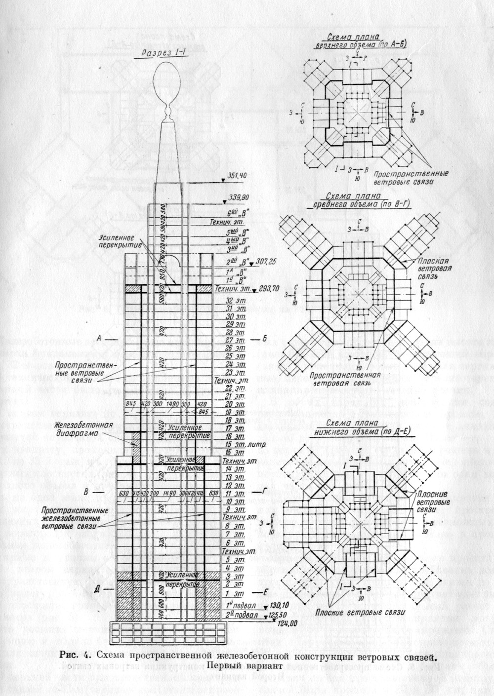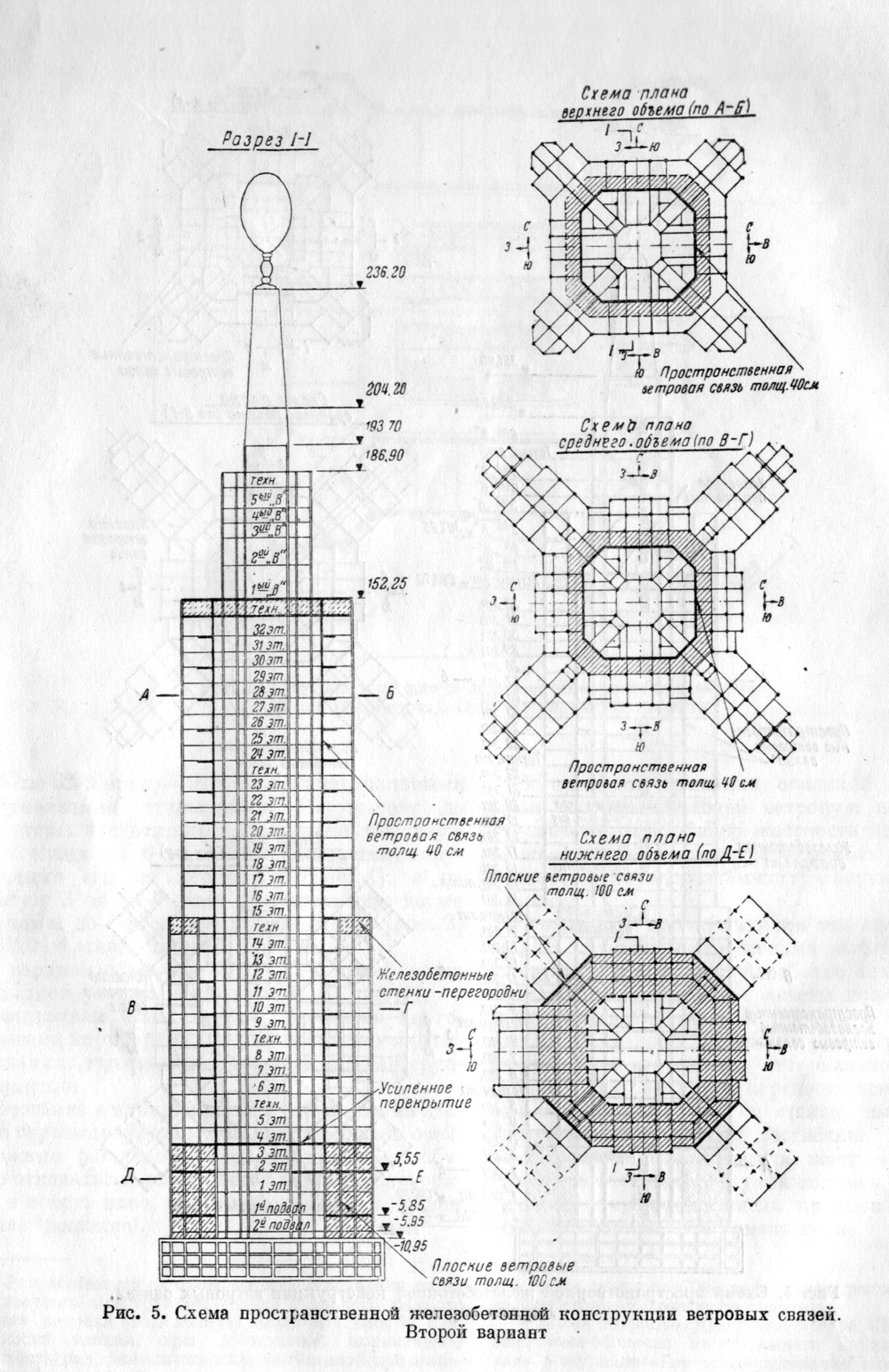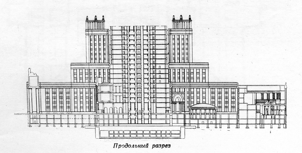 Сочетание в плане высотной части здания в Зарядье взаимно перпендикулярных и диагональных осей, усложнив расстановку колонн каркаса, побудило отказаться от шаблонной рамной конструкции и искать иное, более эффективное решение. В принятом решении основной конструкцией, воспринимающей ветровую нагрузку и обеспечивающей общую жесткость здания, являлась система пространственных ветровых связей, образовывавших замкнутую восьмигранную призму. В эскизном проекте здания эти связи совмещались с наружными стенами высотной части здания. Однако при разработке технического проекта расчеты показали, что многочисленные оконные проемы в наружных стенах настолько ослабляли конструкцию и снижали ее жесткость, что оказалось значительно более выгодным перенести связи внутрь здания, совместив их со стеной, выделяющей центральный лифтовый вестибюль. Хотя при этой схеме основные размеры образуемой связями жесткой коробки и уменьшались, однако значительное сокращение числа проемов с лихвой это уменьшение компенсировало. Таким образом, железобетонные ветровые связи простирались от верха фундаментной коробки до перекрытия над 32 этажом. В техническом проекте расположение лифтов высотной части было разработано в двух вариантах. В первом варианте по условиям планировки пространственная конструкция связей в виде замкнутой коробчатой системы, близкой в плане к квадрату, проходила в среднем объеме (с 4 по 15 этаж) и в верхнем объеме (с 15 по 32 этаж) в разных плоскостях. В местах перехода от одного объема к другому связи перепускались на один этаж, кроме того, в этих местах для восприятия дополнительных усилий, возникающих от смещения части стенок, в плоскости перегородок вводились специальные вертикальные железобетонные диафрагмы, перпендикулярные к граням коробчатой конструкции. Во втором варианте удалось осуществить пространственную конструкцию связей на всю высоту, с 4-го по 32-ой этаж, без смещения плоскостей граней – в виде призмы одного диаметра. Это решение значительно упростило конструкцию и создало благоприятные предпосылки для ощутимого ускорения производства работ. В обеих вариантах конструкции связей, разработанных в техническом проекте, пространственная коробчатая система доводилась только до уровня 4-го этажа. От верха фундамента до 4-го этажа связи были решены в виде четырех железобетонных стен, расположенных перпендикулярно к диагональным осям высотной части. На примере эволюции конструктивных решений московских высотных зданий можно видеть, насколько продумано и последовательно ставились задачи, насколько учитывался в проектировании новейший практический опыт. По существу, каждое из высотных зданий представляло собой уникальную экспериментальную площадку, на которой отрабатывались и совершенствовались те или иные технические идеи. Придя к наиболее экономичным и наиболее совершенным в инженерно-техническом отношении конструктивным решениям, отечественная строительная наука фактически за четыре года совершила гигантский качественный скачок, который при других обстоятельствах мог бы занять несколько десятилетий. По некоторым данным, в восьмой высотке хотели разместить Наркомат тяжёлого машиностроения. Почти все предлагавшиеся до войны конкурсные проекты здания для размещения этого ведомства выгля